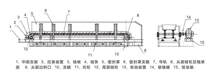 電動機啓動後經減速裝置減速,經過聯軸器将動力傳(chuán)到主動軸上,主動軸上的鏈輪帶(dài)動鏈輪轉動,同時頭尾裝置中與鏈輪相咬合的鏈條随主副鏈輪轉動,