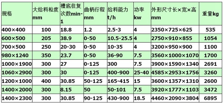 槽式給料機主要由電動機、減速機、聯軸器、偏心機構、漏闆、槽架、滾輪等幾個主要部件組成。其結構的共同點是均裝有可控制料層高度的調節閘闆;在輸料槽下部爲一前後移動的給料闆。其不同點是給料闆角度不一樣,一般爲沿卸料方向向下傾斜5º,以及更大的傾角(小於(yú)物料的靜堆積角)和角度爲零的水平型等。給料闆的動作有前後往複移動式,抖動式以及擺(bǎi)動式等,傳動機構均爲曲柄回轉式。