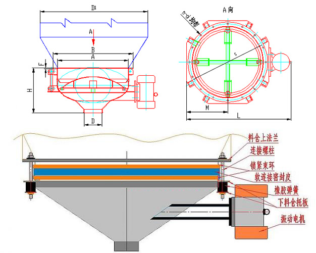 振動給料鬥安裝注意:1、使用單位的料倉出口法蘭應和本機料倉接口法蘭尺寸一緻。