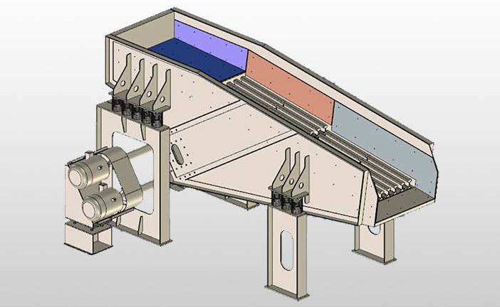 雙質體振動給礦機:採用雙質體近共振慣性振動原理。上下布置單排或雙排剪切橡膠彈簧,由下壓闆通過螺栓連接在平衡體上,再由左右側闆與槽體連接。結構緊湊、衡壓平穩啓動、不受槽體物料載重和卡死的影響 給礦粒度(0-850mm),給料量大(8-1800t/h),可以配置無級變頻器,實現變頻給料、配料,遠距離微機操作控制。