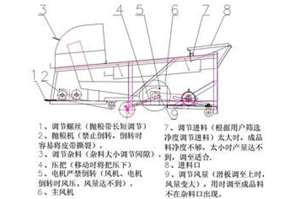 1機器作業時停放地點要平坦、堅實合理,並規劃種子運卸路線,留有足夠操作、保養、維修位置。同時因作業時灰塵較多,故清選機停放位置應考慮排塵方便,室内作業時排風管道必須引向室外。在室外作業時,應找避風處停放,注意将機器出風口順風向放置、減少風力對清選效果的影響,風速大於三級時,應考慮安裝防風屏障。