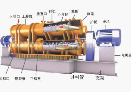 振動磨機由雙圓筒依靠聯接闆固定成一體,聯接闆上同時固定著(zhe)激振器,且激振器需通水冷卻,雙圓筒由隔振彈簧支承,彈簧支座固定在不參振的底架上。由電動機通過撓性聯軸器和萬向聯軸器帶動激振器的軸旋轉,激振器的軸上帶有偏心塊,由於帶偏心塊軸的旋轉使雙圓筒做近似的圓振動。筒體内充填研磨介質(鋼球或鋼棒)和待粉磨物料,物料既可從上圓筒的進料口進入,上圓筒内粉磨完畢的物料流入下圓筒繼續粉磨,最後從下圓筒的出料口排出,即單進單出;物料也可同時進入上下圓筒進行粉磨,然後同時排出,即雙進雙出或雙進四出。筒體做圓振動時,筒内的介質和物料在筒内翻轉,互相沖擊,這種有規律的翻轉、沖擊和介質的自轉,使物料在短時間内得到粉碎,並(bìng)達到理想的粉碎效果,圓筒筒體由外筒、内襯筒和端蓋組成。内襯筒是可更換的,由耐磨材料制成。 ZM系列振動磨的激振器由四組主副偏心塊組成,調整副偏心塊和主偏心塊的相位角,可改變激振力的大小,從而達到調整振幅大小的目的,振動磨雙振幅的近似值可以從振幅标示牌上讀出。圓筒内的粉磨介質有鋼球或鋼棒兩種。相同直徑和級配的情況下,鋼棒做介質時的産率要高於鋼球做介質時的産率。因爲用鋼球做介質時,要達到同樣的粉狀粒度,粉磨時間較長,但鋼球做介質時能達到更細的粒度。振動磨常用介質爲Φ16-Φ36mm的鋼棒,鋼棒應經過滲碳和淬火,表面硬度應達到HRC55以上。入料粒度>15mm時取較大直徑,入料粒度<15mm時取較小直徑,並(bìng)採用兩種不同直徑鋼棒的混合級配較好。