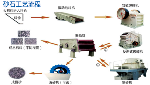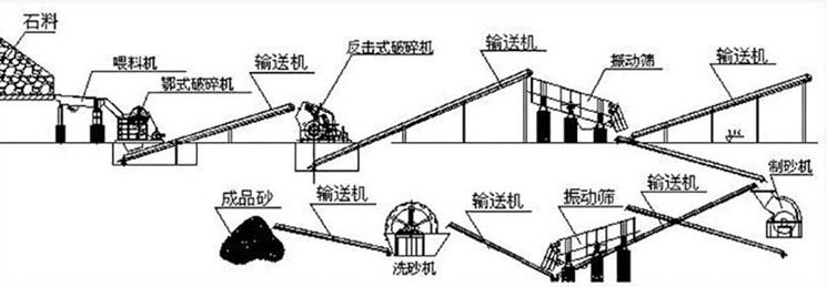 制砂生産線在工作過程中,大塊石料經料倉由振動給料機均勻地送進颚式破碎機進行粗碎,粗碎後的石料由膠帶輸送機送入圓錐破碎機(或反擊式破碎機)進行中碎,中碎後的石料由膠帶輸送機送進振動篩進行篩分,成品砂子(篩下物)由膠帶輸送機送至洗砂機清洗後再通過膠帶輸送機送至成品料堆;大顆粒石料(篩上物)由膠帶輸送機送至立式沖擊破碎機(制砂機)進行細碎,細碎後的石料由膠帶輸送機再次送進振動篩進行篩分,這樣形成閉路多次循環。