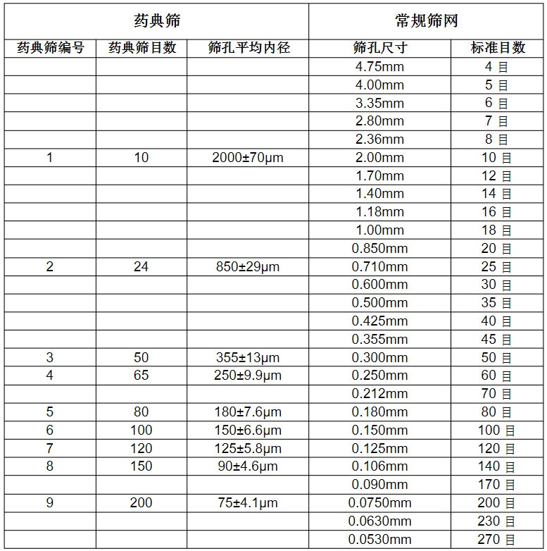 标準藥典篩常規(guī)篩孔徑網目數對(duì)照表