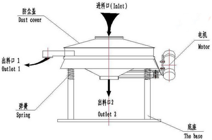 旋振篩起動後,其動力裝置即振動電機上下兩端不同相位的偏心塊、由於高速放置作用而産生一複合慣性力,該慣性力強迫篩機振動體作複旋運動,篩框在振動力的作用下連續作往複運動,進地而帶動篩面作周期性振動,從而使篩面上的物料随篩箱一同作定向踴躍式運動,其間,小於篩面孔徑的物料通過篩孔落到下層,成爲篩下物,大於篩面孔徑的物料經連續跳躍運動後從排料口排出,完成精細篩分工作。