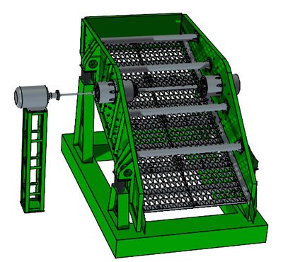 單軸振動篩有一個十分牢靠的篩箱,因爲其結構是焊接及鉚接而成,在振動器的主軸上不僅中間位置有偏心軸,而且主軸兩頭也有能夠調節的偏心輪。在篩分時,電動機經由三角帶作用於振動器,傳動軸使偏心軸及偏心輪産生慣性力,這種慣性力會令篩箱作近似的圓形的運動,使物料得到瞭最佳的篩分效果。