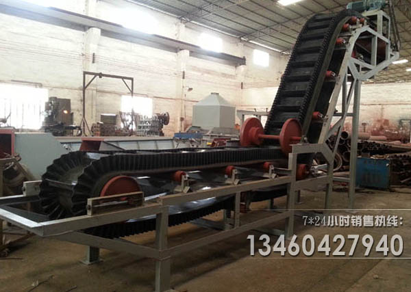 a)大傾角擋邊皮帶輸送機工作原理就是在平面的輸送上面分成一格一格的,在皮帶中間焊有一條條的擋闆,在皮帶的兩邊焊的波狀擋邊形成一體,用來輸送散料;