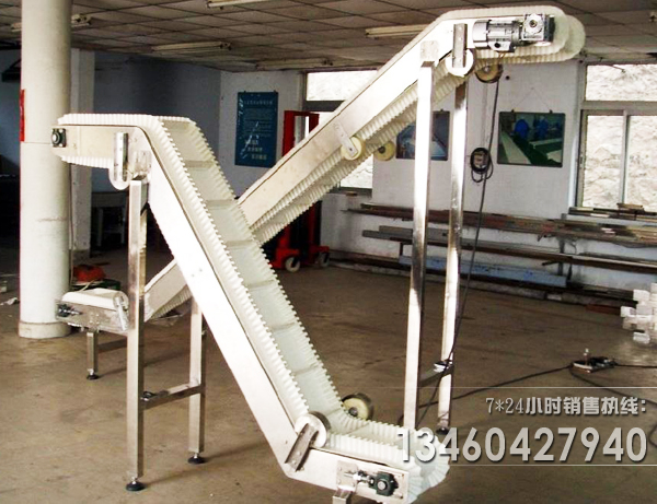 b)擋邊皮帶輸送機用於斜坡輸送,可以把低處産品提升到一定的高度,用於物料提升,在提升的過程中,可以将散料放在一格一格裏面,在傾斜的角度中,不會滑;